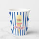 This fun paper cup design starts with a blue and white striped background. On the front and back, it a sugar ice cream cone with four scoops of ice cream. The text on the pink banner reads "here's the scoop", which can be customised.
