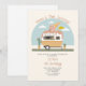 Ice cream themed girl birthday party featuring illustration of a camper with pink ice cream cone on top, and cactus in ice cream cone containers.