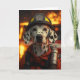 A brave Dalmatian dog dressed as a firefighter, standing in front of a burning scene with sparks flying. The dog wears a fire helmet and protective gear, symbolising courage and heroism.