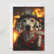 A brave Dalmatian dog dressed as a firefighter, standing in front of a burning scene with sparks flying. The dog wears a fire helmet and protective gear, symbolising courage and heroism.