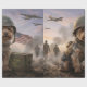 Cinematic Atmosphere: A dramatic dawn backdrop with vintage fighter planes and American flag symbolism.