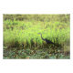A photograph of a Great Blue Heron walking through a pond. The pond's surface is covered with water lilies. The pond is surround with stalks of green plants, which is bordering a meadow. Photograph Copyright ©2021 Kimberly J Tilley.