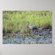 A photograph of a Great Blue Heron walking across a pond. The pond is covered in water lilies. The pond is bordered by green stem plants. Image Copyright ©2021 Kimberly J Tilley.