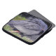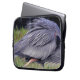 The great blue heron, in the original photograph by MaeFlowers on this 10” Laptop Sleeve, is puffing up his feathers as he walks towards another heron, an invader in his territory. The photo is a closeup of the wild bird's body in profile, showing the long, thin plumage rising at the top, and the wider wing feathers underneath. The heron's body is a soft bluish grey colour, with the blue coming out in the sunlight. There are black feathers on the curve of the wing, with a touch of reddish brown and white. The background is wild grass at water's edge, with a rippled reflection on the water.