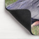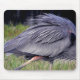 The great blue heron, in the original photograph by MaeFlowers on this Mouse Pad, is puffing up his feathers as he walks towards another heron, an invader in his territory. The photo is a closeup of the wild bird's body in profile, showing the long, thin plumage rising at the top, and the wider wing feathers underneath. The heron's body is a soft bluish grey colour, with the blue coming out in the sunlight. There are black feathers on the curve of the wing, with a touch of reddish brown and white. The background is wild grass at water's edge, with a rippled reflection on the water.
