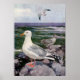 An adult and an immature American herring gull (Larus smithsonianus) are standing on rocks on the shore. The water is green and choppy but looks purple in the distance. These birds are also known as Smithsonian gulls. A vintage illustration from 1922 for a book on the natural history of birds.