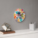 This clock has mid-century modern design of hexagons in many colors with black and white circles inside them.