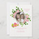 A delightful floral invitation with a hexagon photo frame and clusters of pink flowers with green foliage embellished with three Easter eggs.