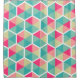 A shower curtain with a geometric pattern made up of six sided hexagons divided by a narrow white space each divided into six colour segments in five harmonious colours.