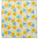 A shower curtain with a geometric pattern made up of six sided hexagons divided by a narrow white space each divided into six colour segments in five harmonious colours.