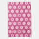 Traditional Japanese kimono print tea towel - nesting hexagons with a central flower motif in deep burgundy wine, fuchsia pink and white on a pastel pink background