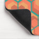 This mouse pad has a geometric design of hexagons in sets of three that look like flowers in gold, orange, and red on a field of teal.