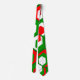 This tie has a Christmas geometric design of hexagons in sets of three that look like flowers in red, white, and green.