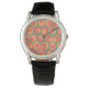 This watch has a geometric design of hexagons in sets of three that look like flowers in gold, orange, and red on a field of teal.