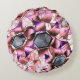 Hexagons surrounded by pinkish petal-like shapes round cushion