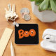 This Halloween and classic one simple word quote retro old school style image design features orange colour lettering with black outline backing, cute barely scaredy boo eyes, periwinkle blue purple dots and black background colour to match on many products.