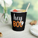 Modern and cute "Hey Boo" Halloween paper party cups design features text in orange and white lettering with a little ghost accent.
