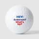Identify your balls with name... simple typography design... red and blue colours... a nice way, with a dash of humour, saying that the ball is yours... if found, please return to... ball missing the owner, with the words "Hey (golfer name). What's up?"