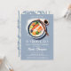 A modern, elegant, minimalist and simple birthday party invitation with a hibachi, Japanese dinner party theme. It features a modern watercolor illustration of a hibachi plate on a dusty blue background and simple, modern, white typography. On the back, a wild bamboo forest. A clean, minimalist, simple design for an elegant soiree of celebration.