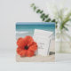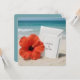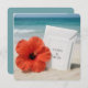 A vibrant red hibiscus flower lies delicately on the sandy beach next to an elegantly embossed blank white wedding invitation.