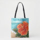 This 16" x 16" customised tote bag features a Becky Schultea original acrylic floral painting, "Hibiscus by the Beach" which includes a tropical orange hibiscus flower and greenery beside a tranquil beach setting with turquoise waves breaking against soft tan sand. You can add any text you like to make it personal, or you can choose to leave the text off completely. This tote will be your go to Summer bag, from the pool to the beach to a cruise vacation, or to the market, gardening centre, a trip to the gym, or carrying your essentials just about anywhere. It would also make a wonderful personalised gift for anyone who loves all things tropical and beachy!