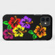 Colourful floral pattern of tropical hibiscus in purple, red, orange, magenta and yellow colours against a black background.