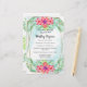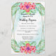 Beautiful tropical hibiscus flower with pink floral, green leaves and turquoise blue watercolor accents and gold frame detail. Celebrate a beach theme with bright and soft ocean tropical island theme colours, perfect for a destination wedding, island cruise or hawaiian getaway elopement.