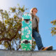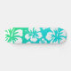 This Hawaiian inspired tropical design features white Hibiscus silhouettes on a blue and green background.