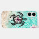 A stylised tribal turtle design with intricate patterns is centred on a turquoise background, surrounded by delicate pink hibiscus flowers. The scene evokes a fun, beachy feel with its blend of nature-inspired elements.