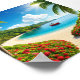 A secluded beach nestled between lush greenery and vibrant red flowers, with a sailboat anchored in the crystal-clear water. The sun shines brightly overhead, creating a picture-perfect tropical paradise.
