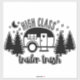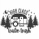 A pod travel trailer under a moon, stars and hearts with evergreens and the word, “High Class Trailer Trash.”