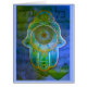 On the cover of this Rosh Hashanah High Holiday card is a gorgeous original painting by digital artist, Leslie Sigal Javorek, featuring an ornate Hamish Hand (Hamsa) floating above a snippet of the original 1907 sheet music for the Kol Nidre, and a twisted Ram's horn or Shofar. In beautiful shades of blue & green, the greeting inside can be personalised. Offered in 3 sizes, the Big size (8.5"x11") shown is suitable for framing.