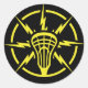 Danger! High voltage lacrosse player. Cool superhero style emblem of lacrosse stick head with lightning bolts shooting out from all sides.