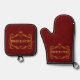 Tongue-in-cheek country slang describes those that have gotten a little "too big for their britches" / pretentious. Oven mitt and potholder design features gold text and crown frame on dark red background.