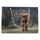 Highland cow calf autumn grass field photograph. Stunning young calf of highland Scottish cattle on an autumn grassy field with muted colours. Beautiful dark hairy orange coat contrasting with light yellow green grass and trees in bokeh in background.