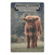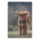 Highland cow calf autumn grass field photograph. Stunning young calf of highland Scottish cattle on an autumn grassy field with muted colours. Beautiful dark hairy orange coat contrasting with light yellow green grass and trees in bokeh in background.