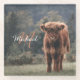 Highland cow calf autumn grass field photograph. Stunning young calf of highland scottish cattle on an autumn grassy field with muted colours. Beautiful dark hairy orange coat contrasting with light yellow green grass and trees in bokeh in background. Custom personalizable monogram with your name and inital on the left.
