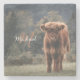 Highland cow calf autumn grass field photograph. Stunning young calf of highland scottish cattle on an autumn grassy field with muted colours. Beautiful dark hairy orange coat contrasting with light yellow green grass and trees in bokeh in background. Custom personalizable monogram with your name and inital on the left.