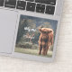 Highland cow calf monogram first birthday party. Stunning young calf of highland scottish cattle on an autumn grassy field with muted colours. Beautiful dark hairy orange coat contrasting with light yellow green grass and trees in bokeh in background. Custom personalizable monogram with your name and initial on the left. Everything for the first birthday of your child, invitations, paper plates, cups and more.