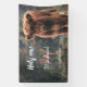 Highland cow calf monogram first birthday party. Stunning young calf of highland scottish cattle on an autumn grassy field with muted colours. Beautiful dark hairy orange coat contrasting with light yellow green grass and trees in bokeh in background. Custom personalizable monogram with your name and initial on the left. Everything for the first birthday of your child, invitations, paper plates, cups and more.