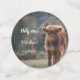 Highland cow calf monogram first birthday party. Stunning young calf of highland scottish cattle on an autumn grassy field with muted colours. Beautiful dark hairy orange coat contrasting with light yellow green grass and trees in bokeh in background. Custom personalizable monogram with your name and initial on the left. Everything for the first birthday of your child, invitations, paper plates, cups and more.