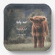 Highland cow calf monogram first birthday party. Stunning young calf of highland scottish cattle on an autumn grassy field with muted colours. Beautiful dark hairy orange coat contrasting with light yellow green grass and trees in bokeh in background. Custom personalizable monogram with your name and initial on the left. Everything for the first birthday of your child, invitations, paper plates, cups and more.