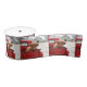 A Highland cow sits in a vibrant red retro truck, set against a picturesque winter scene with an old wooden barn