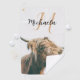 Highland cow portrait custom name initial monogram. Portrait photograph of a majestic orange brown highland cattle on a foggy day with white background.