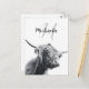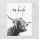 Highland cow portrait custom name initial monogram in black and white. Portrait photograph of a majestic highland cattle on a foggy day with white background in black and white.