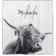 Highland cow portrait custom name initial monogram in black and white. Portrait photograph of a majestic highland cattle on a foggy day with white background in black and white.