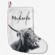 Highland cow portrait custom name initial monogram in black and white. Portrait photograph of a majestic highland cattle on a foggy day with white background in black and white.