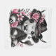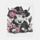 A cute black and white Highland cow decorated with a stylish black hat adorned with pink flowers, showcasing charm and artistic design.