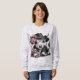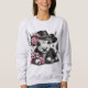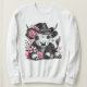 A cute black and white Highland cow decorated with a stylish black hat adorned with pink flowers, showcasing charm and artistic design.