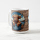 Charming illustration of a Highland cow sitting in a bucket against a scenic landscape with flowers and clouds. The wooden texture adds a rustic feel.